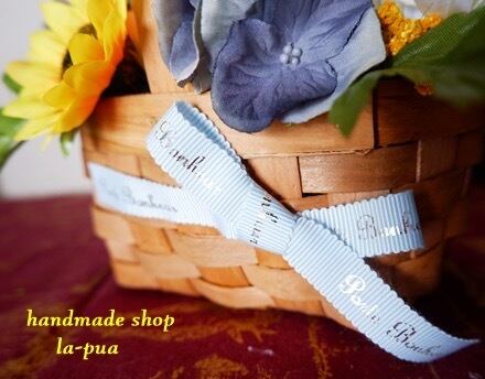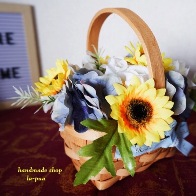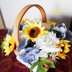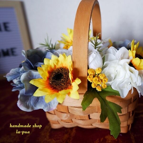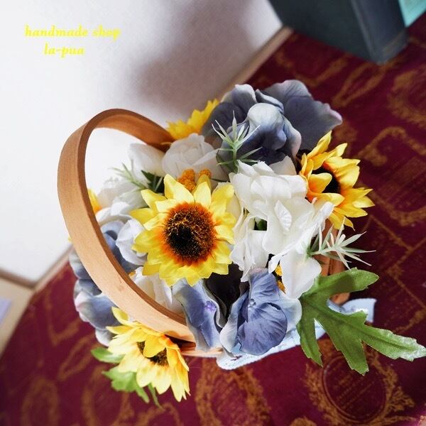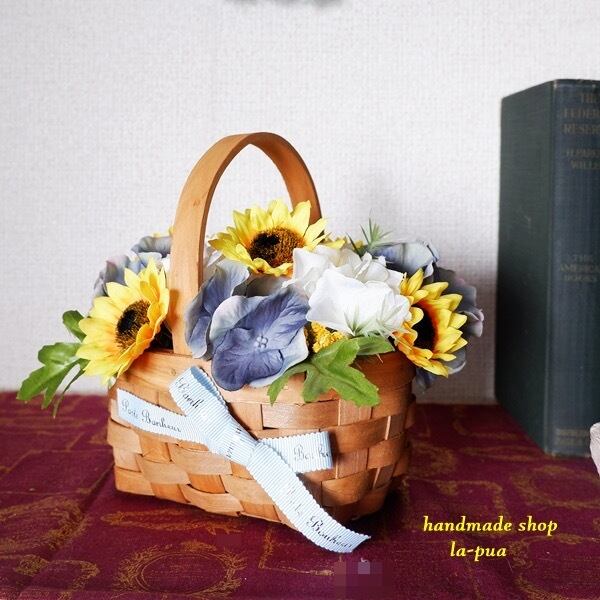小さめのひまわりをたっぷり使ったバスケット これからの夏のシーズンにぴったり ひまわり、バラ、紫陽花全てアーティフィシャルフラワー(造花)です。 サイズ横15センチ×縦(持ち手含む)15センチ×奥行15センチ リボンには『幸運の』と書いてあります。 父の日のプレゼントにもピッタリ