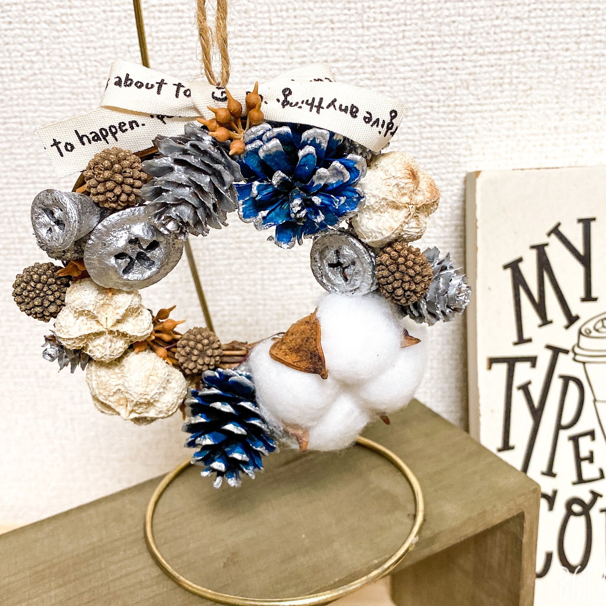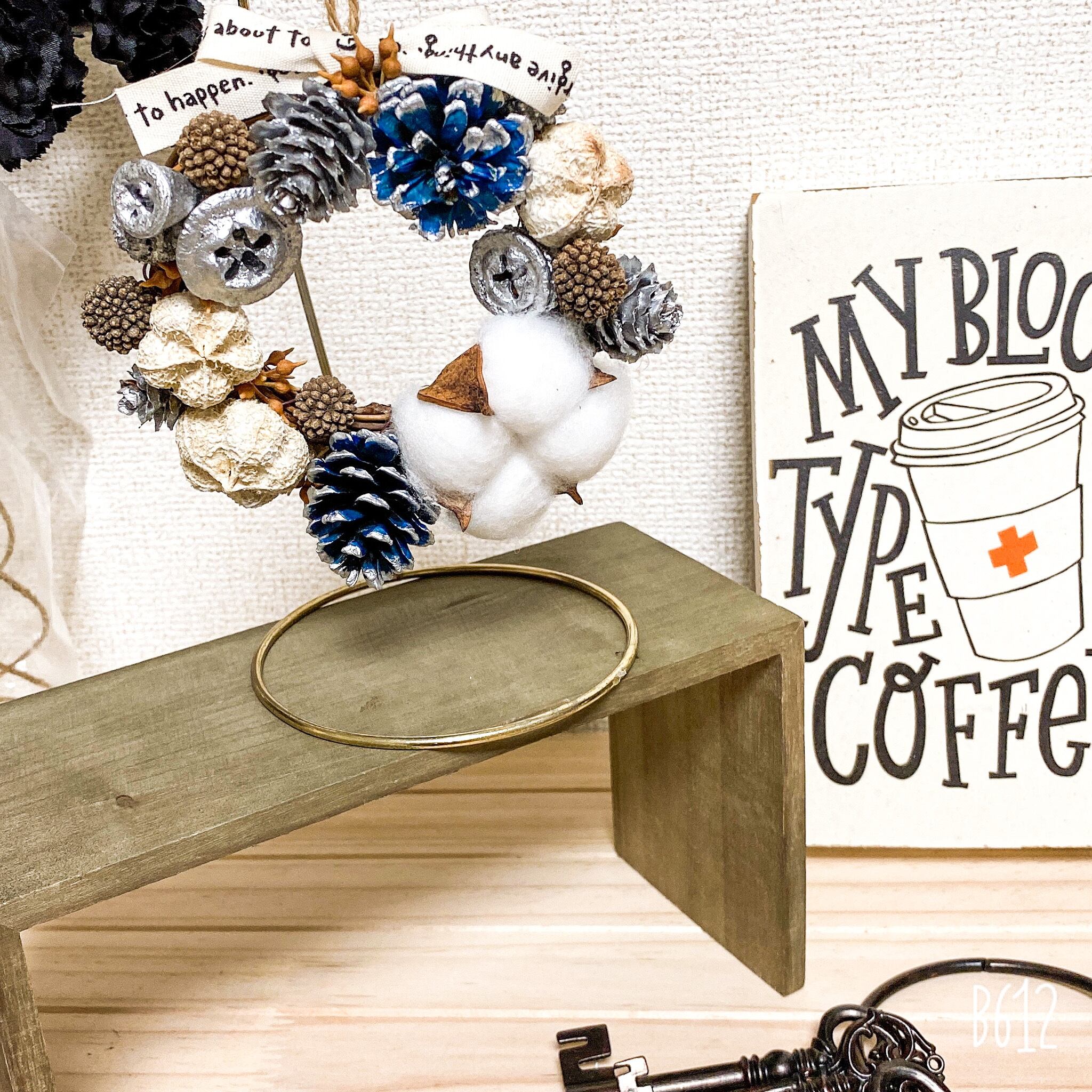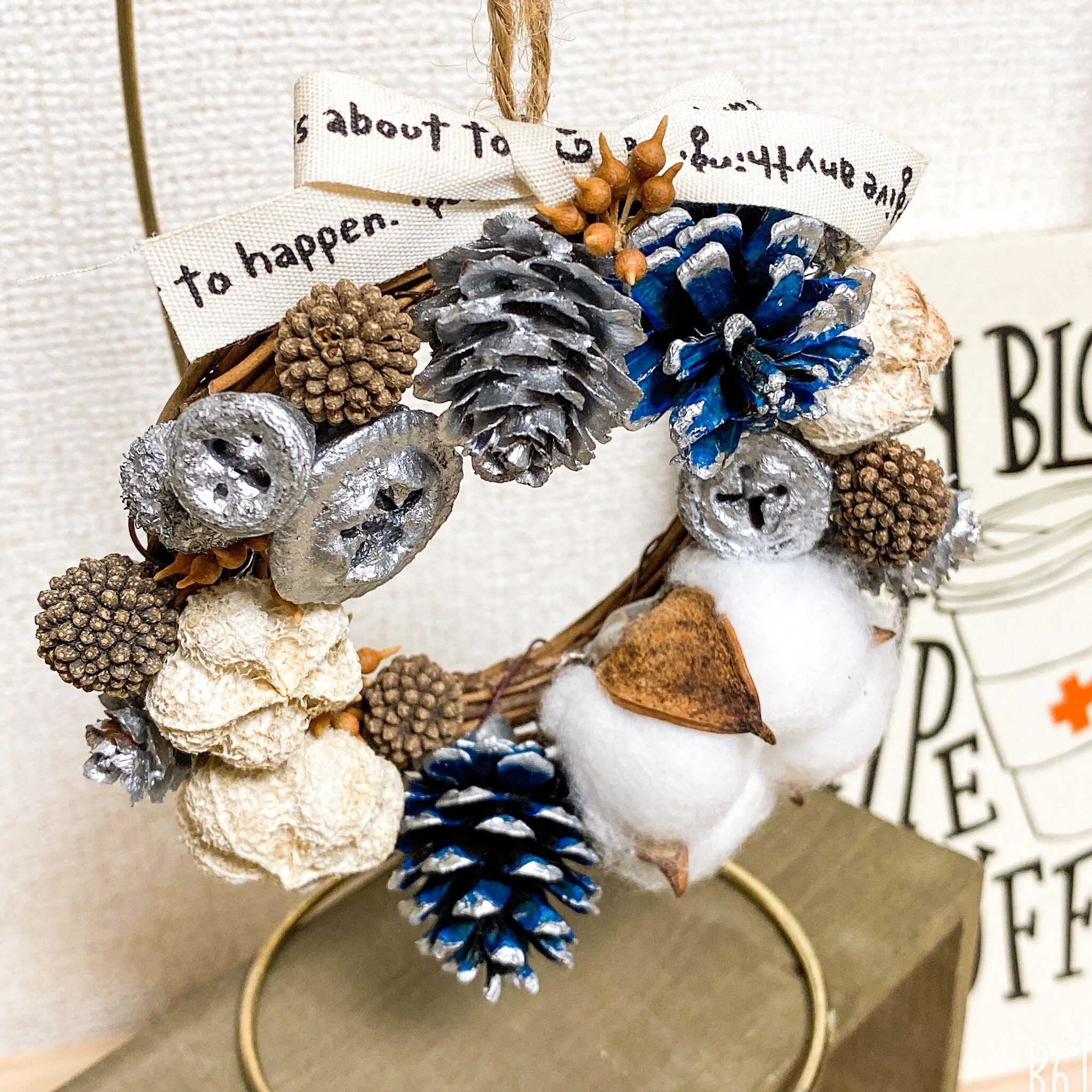 コットンや松ぼっくりなど、たくさんの木の実を使ったミニリースです。 壁やドアリースにしても可愛いし、スタンドで玄関コーナーに飾っても可愛いと思います。 ハロウィンのインテリアとも相性がいいです。 シックな色合いで大人可愛い雰囲気に仕上げました。 直径13cmミニリース 花材 リース→木製 コットン 、松ぼっくり、木の実