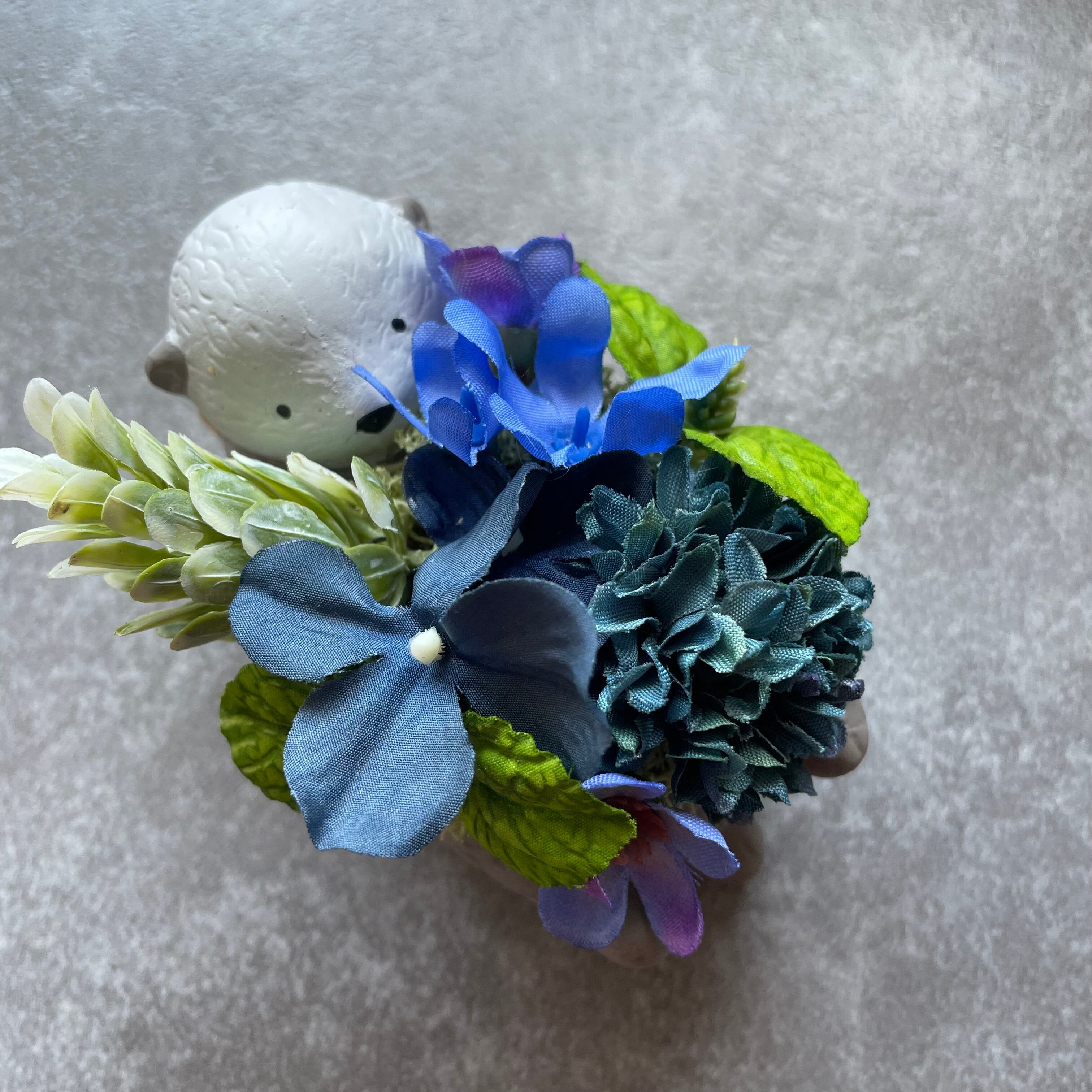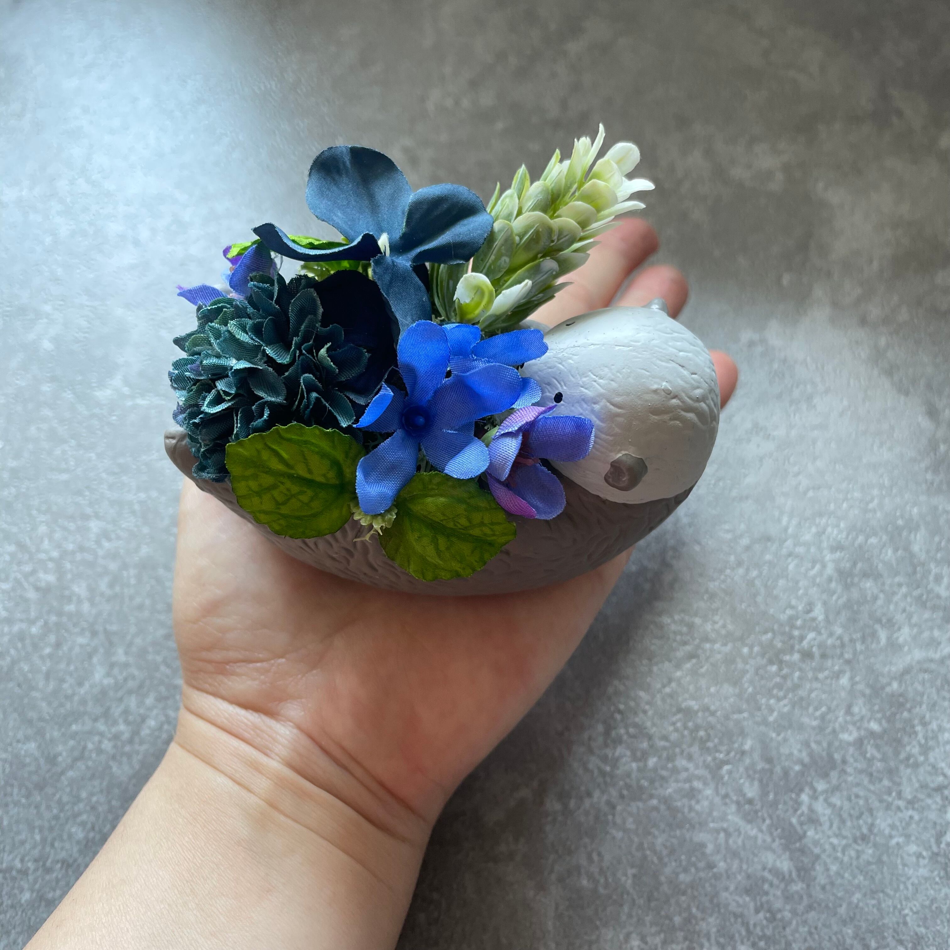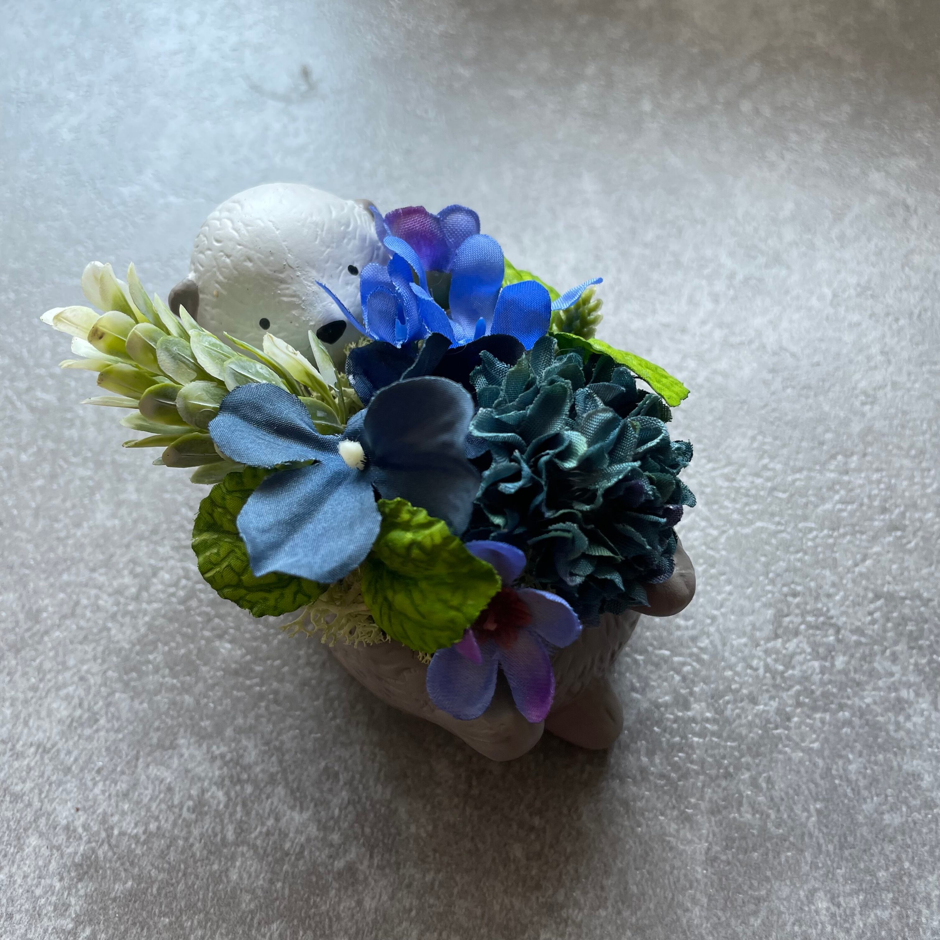 可愛いラッコのミニポット 一生懸命お花を抱えてるように見えきゅんとなるデザインです。 全てアーティフィシャルフラワー(高級造花)を使用 水やり、植え替え不要です。 直射日光を避けていただければ3年以上キレイな色で楽しめます。 手のひらサイズなので、窓際コーナーやプレゼントにも