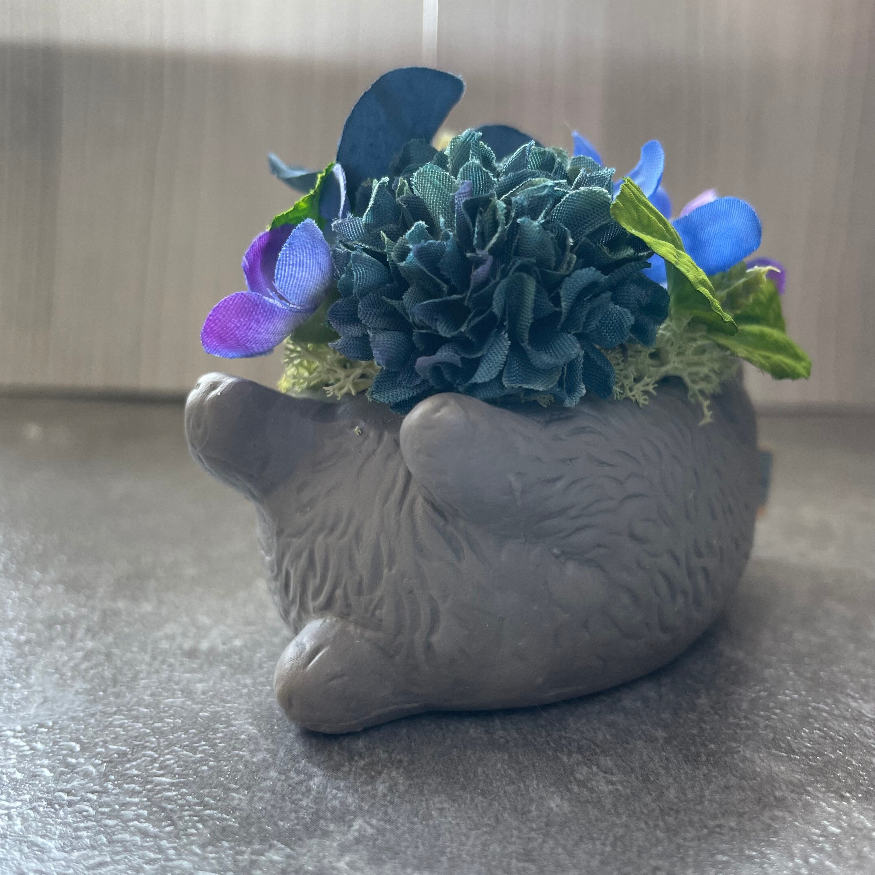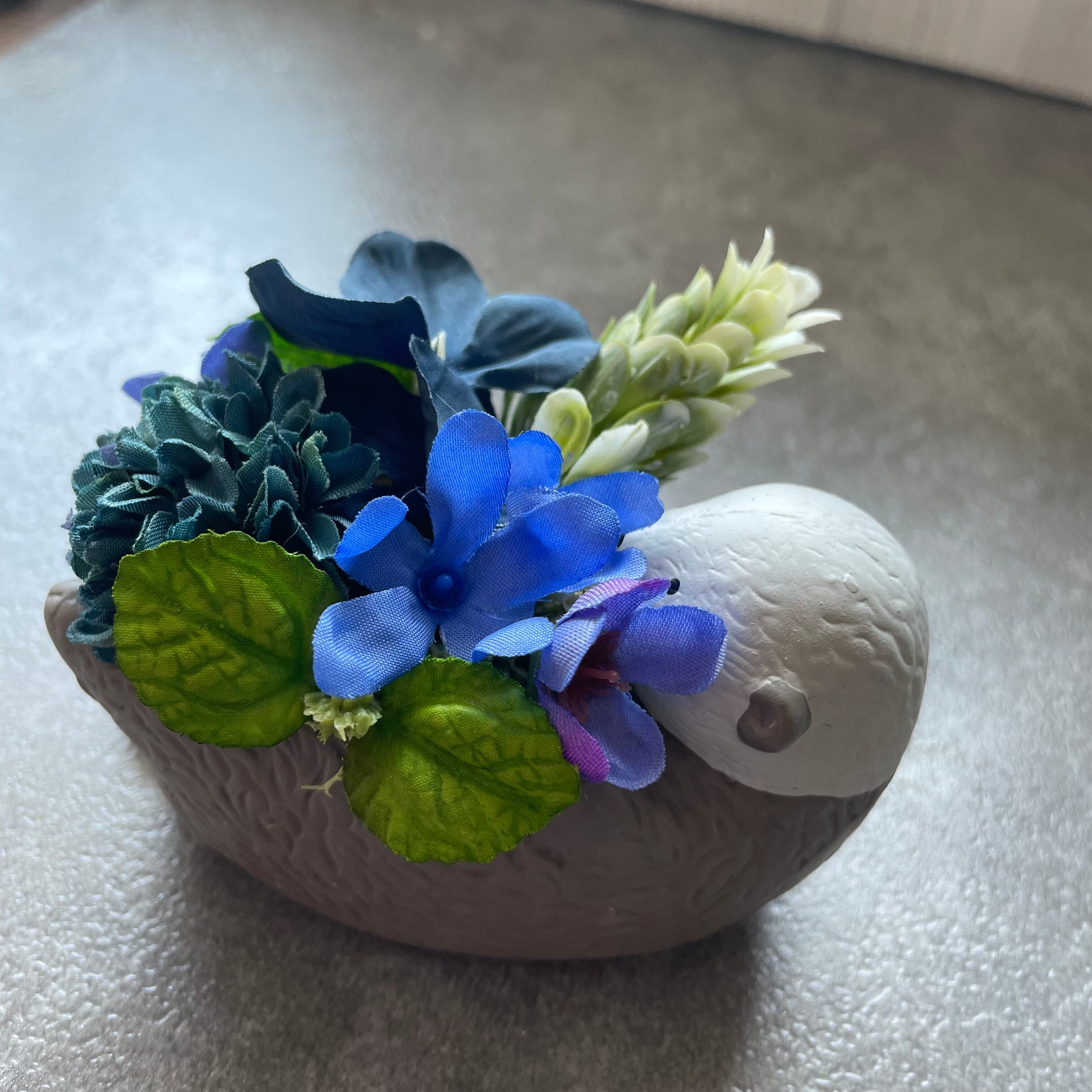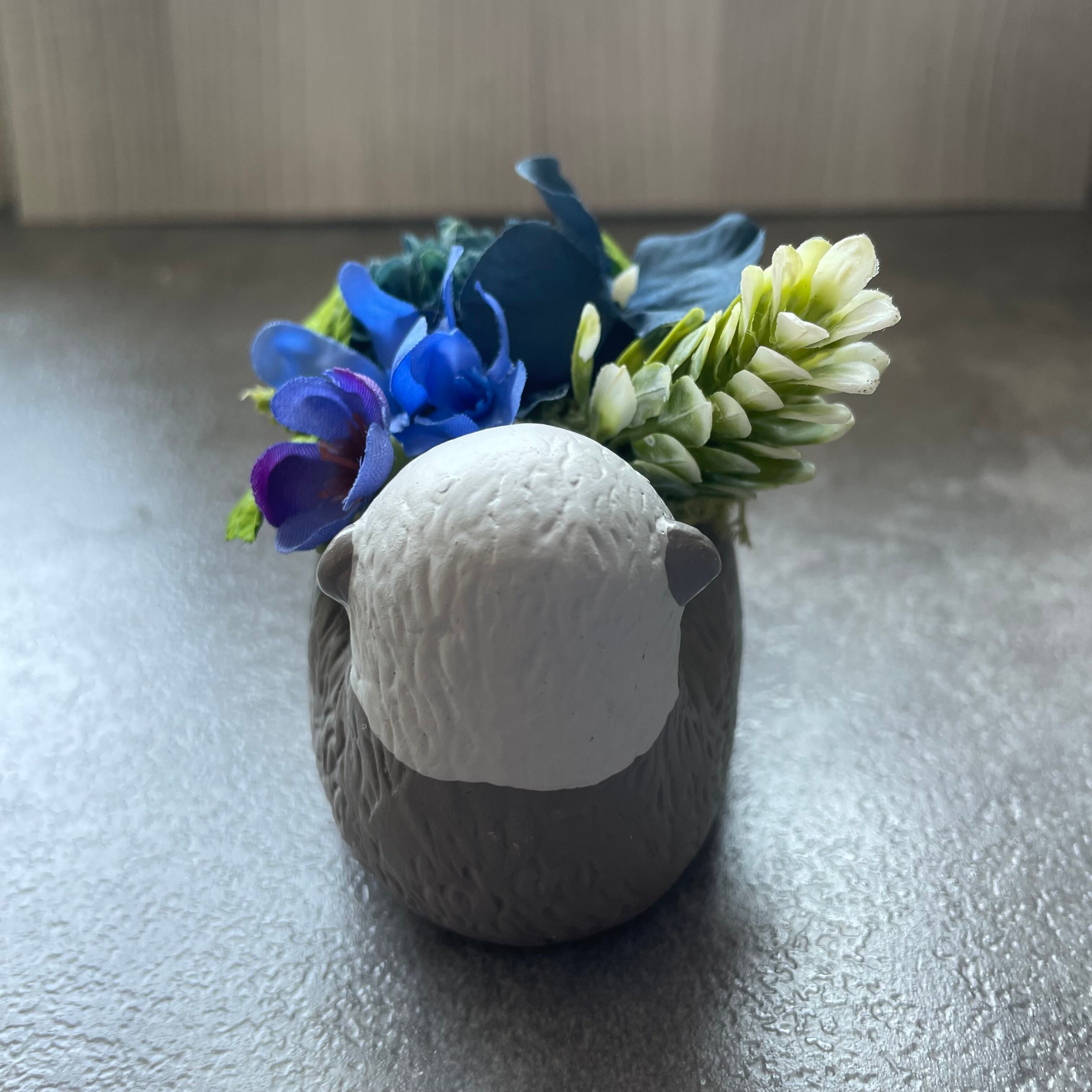 可愛いラッコのミニポット 一生懸命お花を抱えてるように見えきゅんとなるデザインです。 全てアーティフィシャルフラワー(高級造花)を使用 水やり、植え替え不要です。 直射日光を避けていただければ3年以上キレイな色で楽しめます。 手のひらサイズなので、窓際コーナーやプレゼントにも
